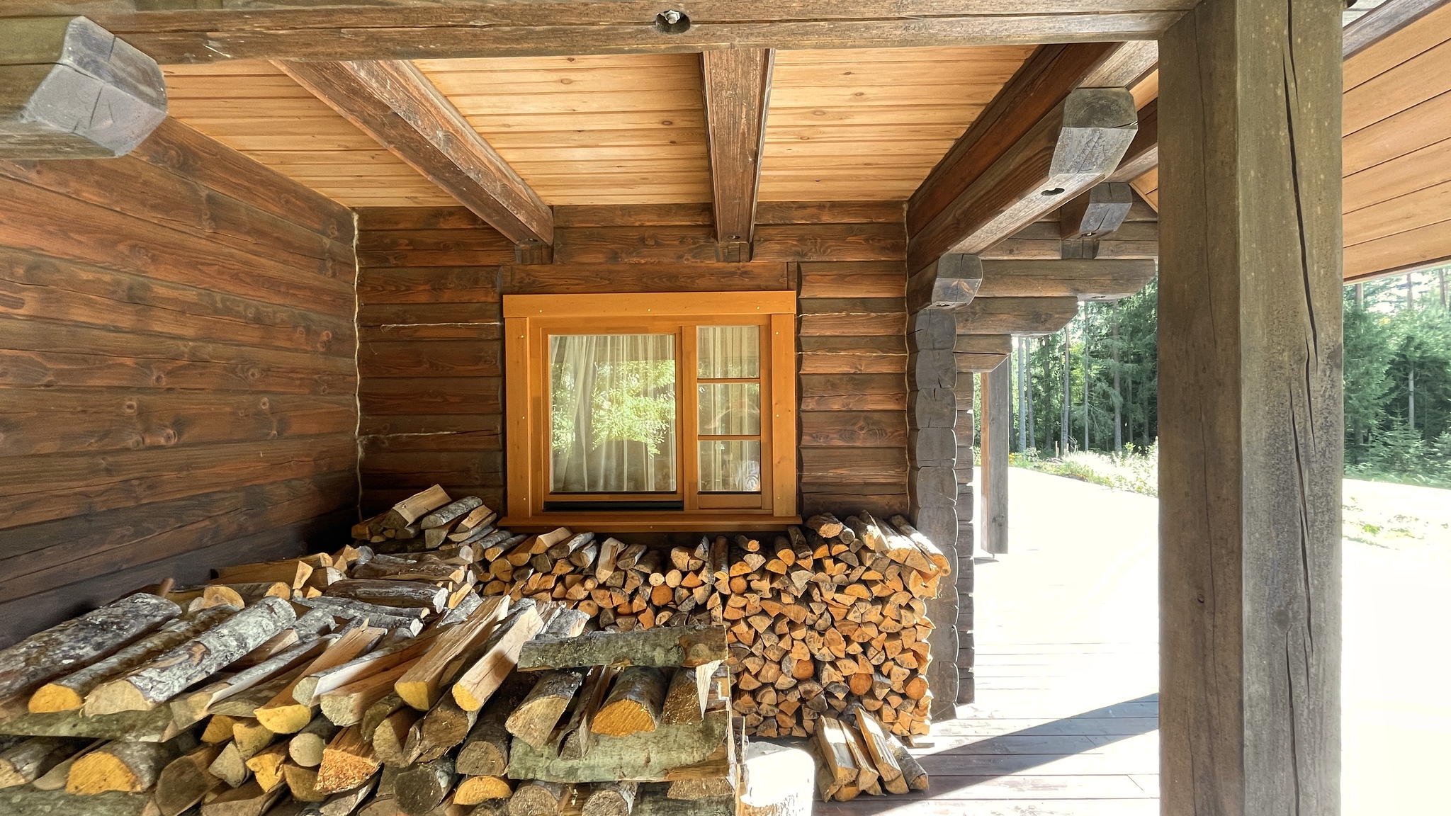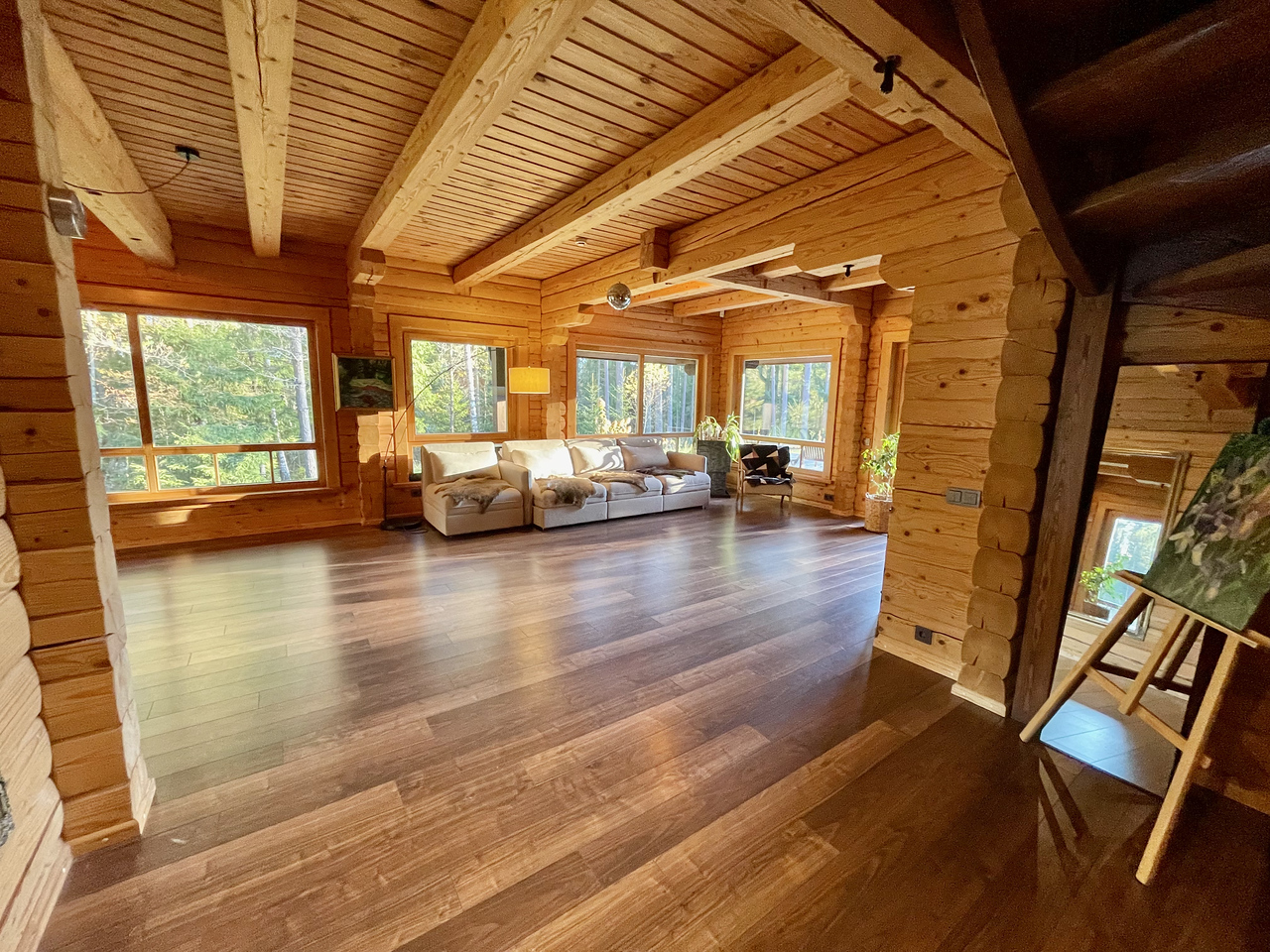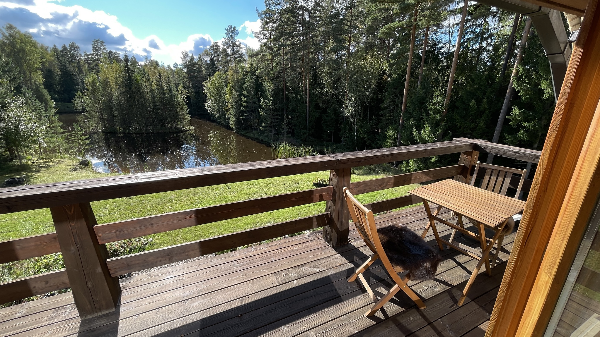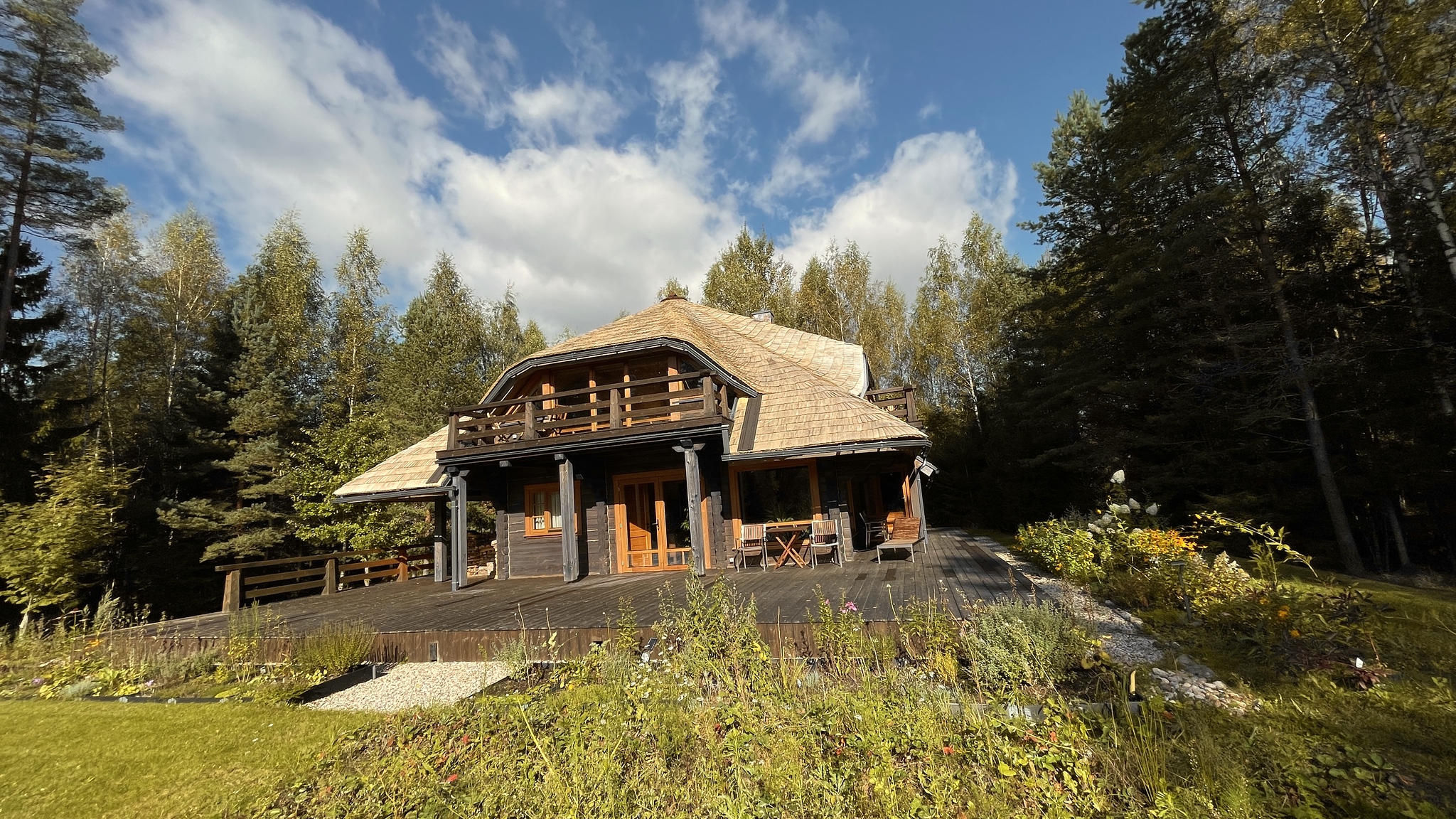 Divstāvu guļbaļķu māja ar 2025. gadā nomainītu koka lubiņu jumtu. Īpašums ir meža ieskauts ar tiešu piekļuvi dīķim un privātu salu, radot unikālu un noslēgtu pagalmu.