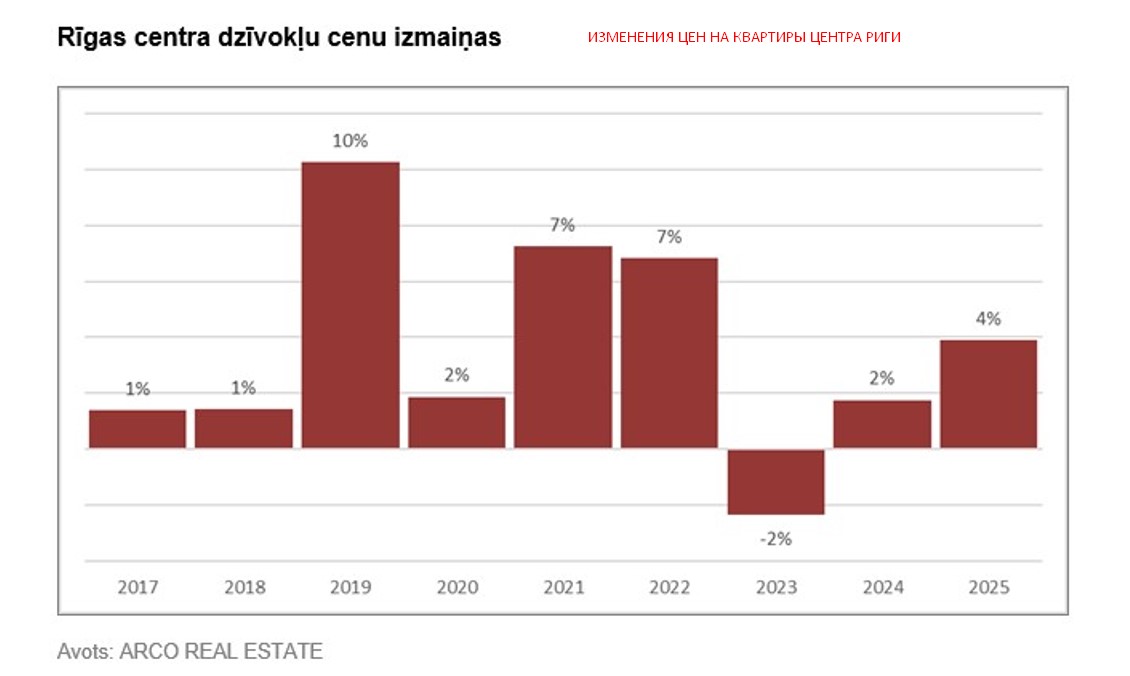 Цены на квартиры в центре Риги в 2025 году увеличились на 4% и достигли 1 874 евро за кв. м. Подорожание наблюдалось ежегодно начиная с 2016 года, за исключением небольшого снижения, случившегося в 2023 году. Самый стремительный подъем пришелся на 2019 год, когда рижские квартиры прибавили в цене более чем на 10%. В 2025 году квартиры в центре Риги стоили на 37% дороже, чем в 2016 году.